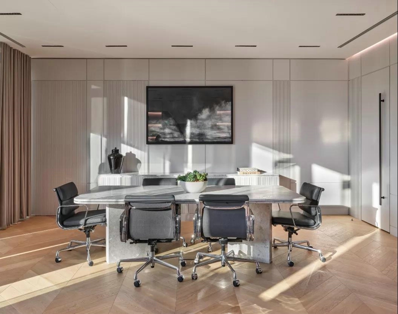 二、通高的雙面板材隔斷系統(tǒng) ▶雙面板材的辦公室通高隔斷系統(tǒng) ◎根據(jù)辦公場景的不同,比如石膏板乳膠漆、石膏板藝術(shù)涂料、木飾面板、皮革布藝硬包、成品板等等都可以。 1、石膏板乳膠漆。一些日常通勤的空間,采用鋼骨架與石膏板乳膠漆隔斷,也是辦公場景中最常見的一種做法,比較簡潔與經(jīng)濟(jì)。