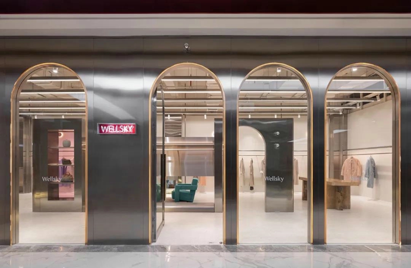 (4)門頭外觀設(shè)計(jì)。門頭的外觀在設(shè)計(jì)上要與周圍環(huán)境以及品牌調(diào)性和品類相協(xié)調(diào)。門頭外觀展現(xiàn)服裝店的檔次和個(gè)性,常用的有兩種風(fēng)格分別是現(xiàn)代風(fēng)和傳統(tǒng)風(fēng),通常商場(chǎng)里的服裝店門頭都是以現(xiàn)代風(fēng)為主。在設(shè)計(jì)上要與周邊的環(huán)境互相協(xié)調(diào)融合,門頭外觀的整體風(fēng)格要依據(jù)甲方品牌的調(diào)性和品類來(lái)決定,如果是比較有地域特色的服飾可以采用傳統(tǒng)風(fēng)格。