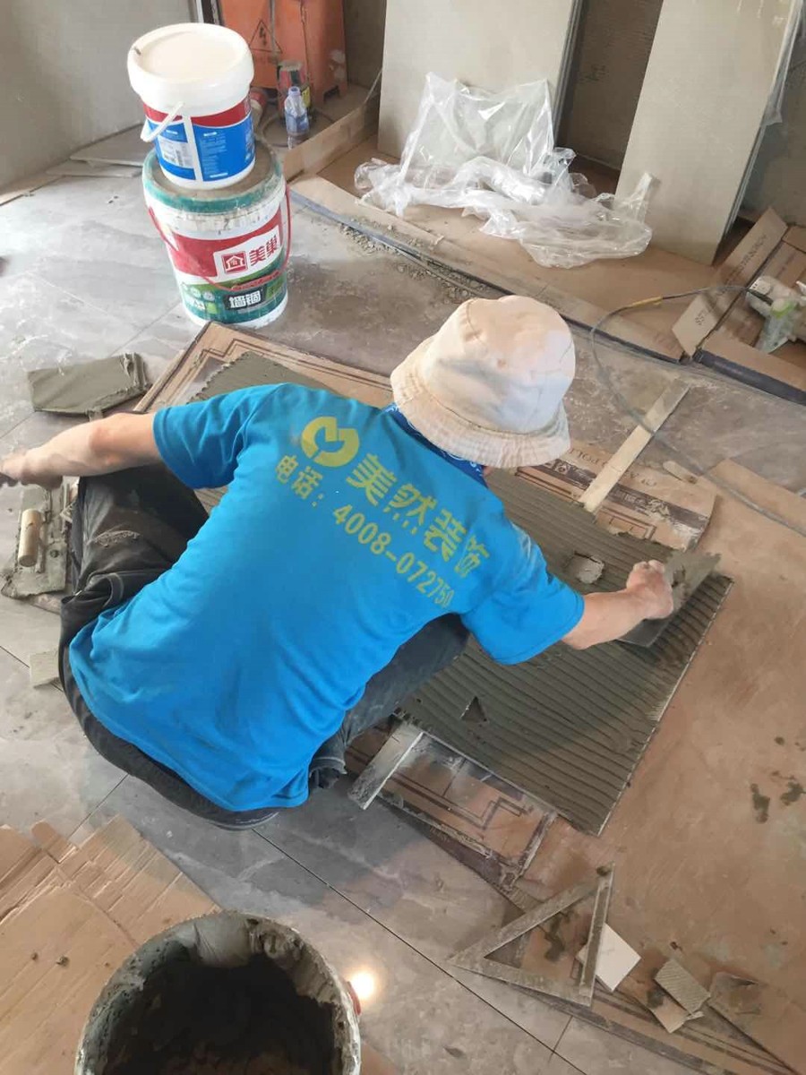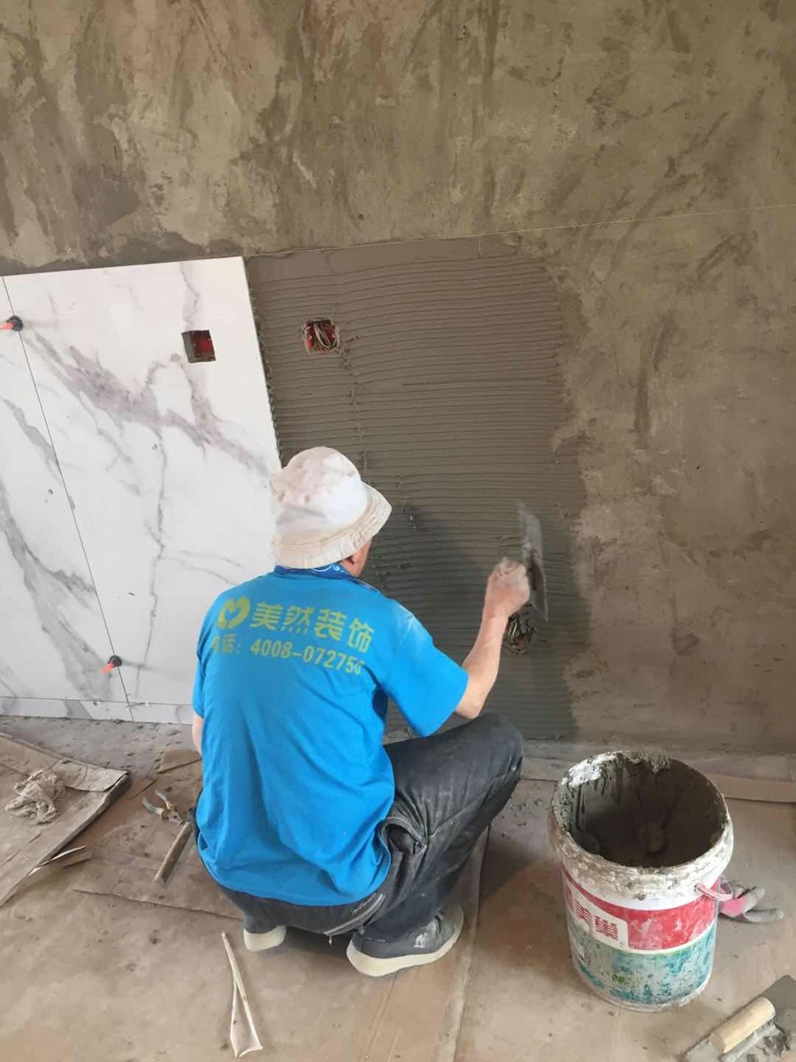 五、5月3日,今天正在進(jìn)行電視背景墻施工,干活的是李師傅,貼磚20多年了,在美然裝飾也是老工人,聽說有八年了,干活挺認(rèn)真的,手藝不錯(cuò),工程負(fù)責(zé)人說為了防止瓷磚脫落,用的是薄貼法施工,這樣比較結(jié)實(shí)。